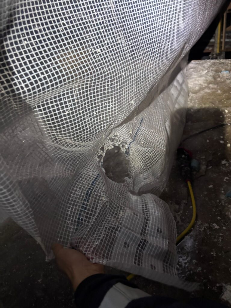 Nach der ersten Lageerkundung durch den Einsatzleiter konnte festgestellt werden, dass bereits Löcher aufgrund der starken Wärmeentwicklung der Heizgeräte in der Plane waren.