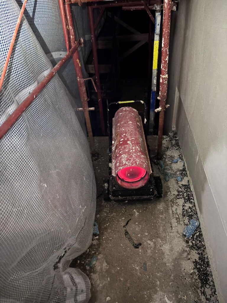 Die Fassade war mit einer Plane abgedeckt da Verputzarbeiten durchgeführt werden und die Innenseite wurde mittels Diesel- und Gaskanonen beheizt.